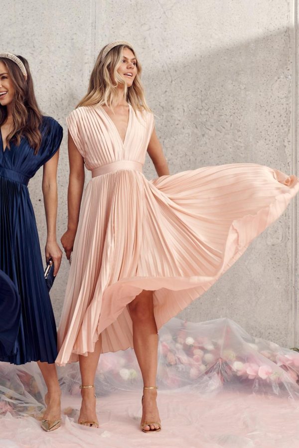 Feel extra special in our Anetta Midi Dress! This sweet style features a gorgeous V neckline, cinched waist, and all over pleated fabric which will fit and flatter you in all the right places! Embrace the upcoming party season and style yours with sparkly drop earrings and sleek stilettos.
