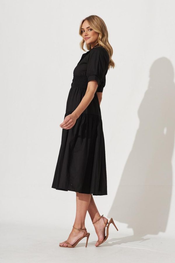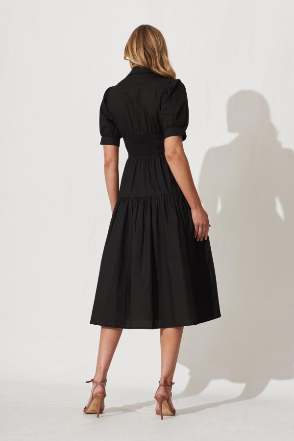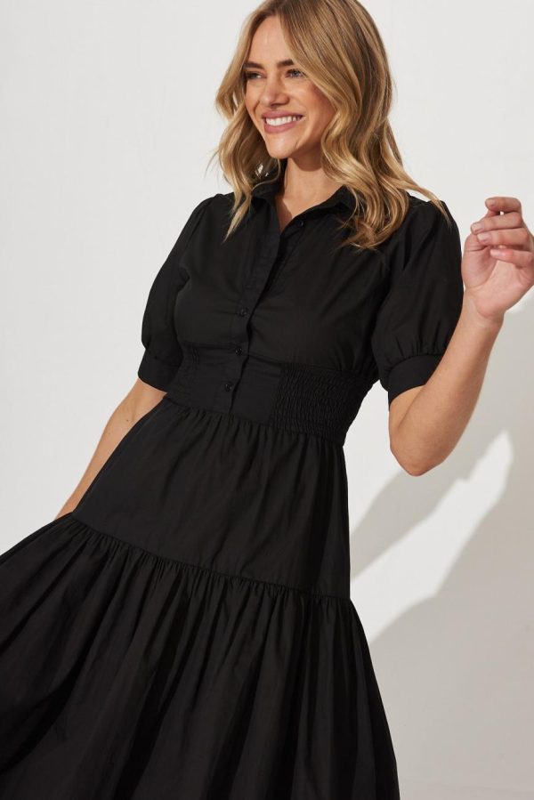 Be out the door in an instant with our Fairfax Midi Shirt Dress! An elevated but easy to wear shirt style with its button down front, shirred waist, and feminine tiered skirt. Style yours with chunky sandals and layered gold jewellery for your next casual lunch!