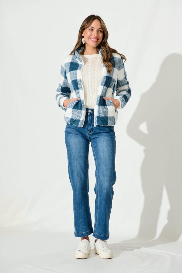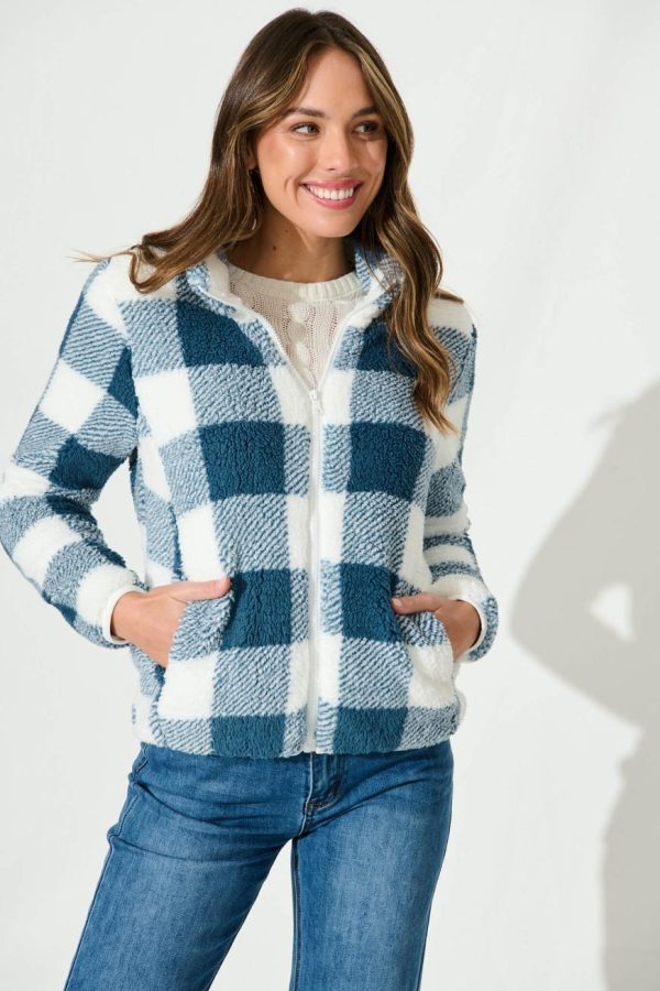 St Frock Linea Fluffy Jacket In Blue With White Check | Women Outerwear