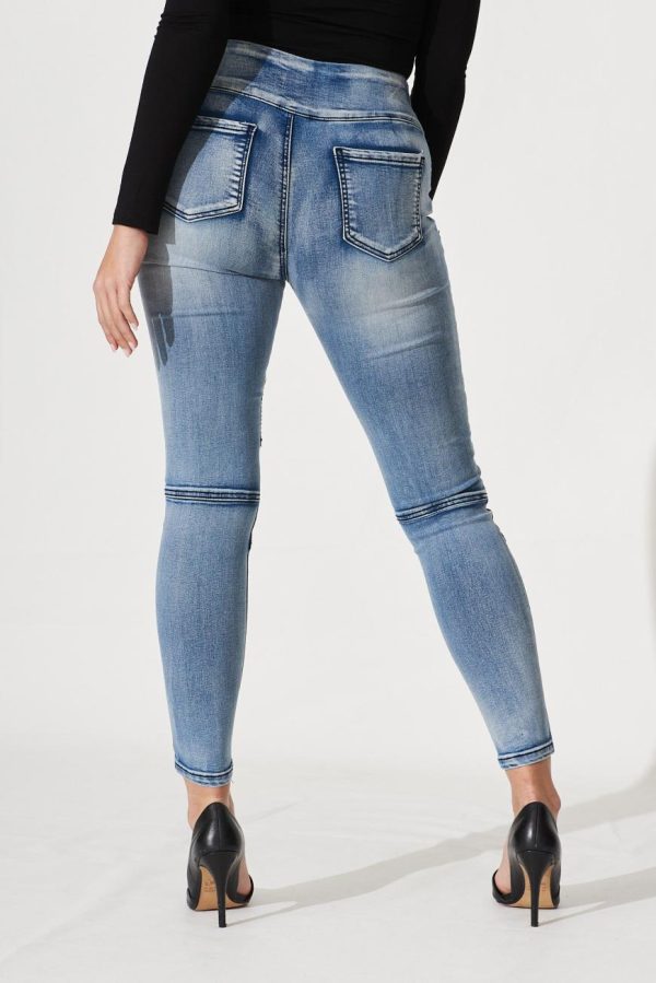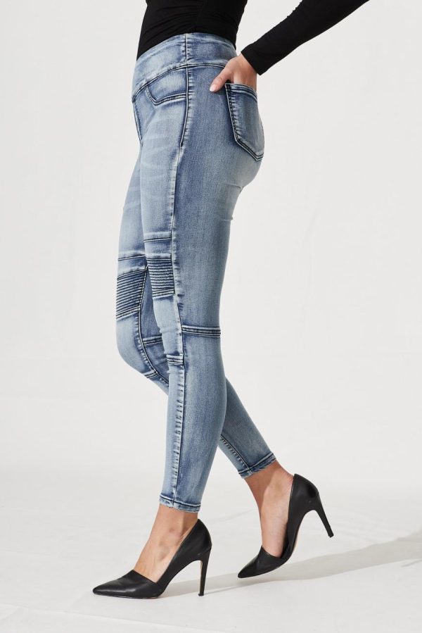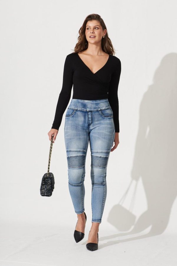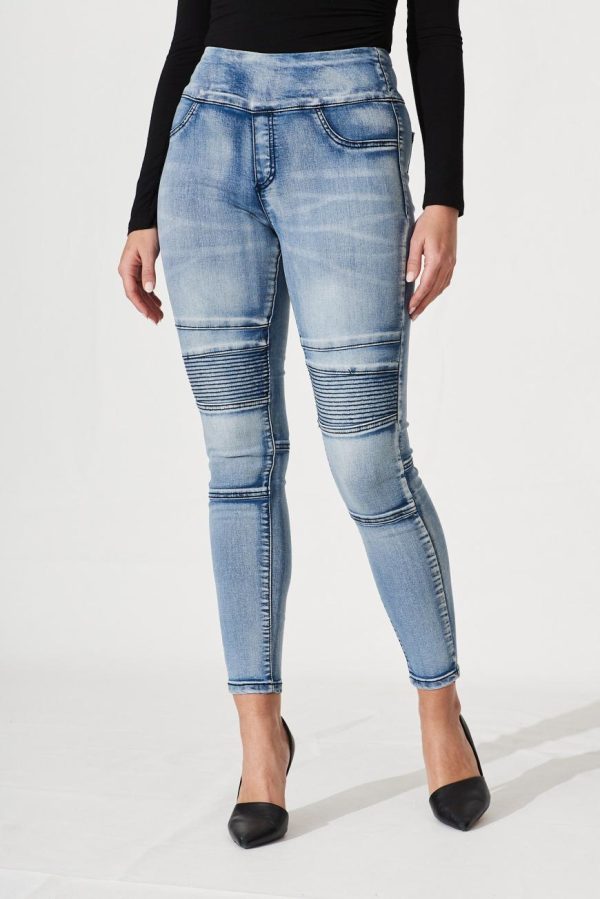 Channel your inner badass in the Little Lies Jeggings in Mid Blue! These high rise skinny jeans feature chic paneling and contrast stitching. Pair yours with a leather jacket!